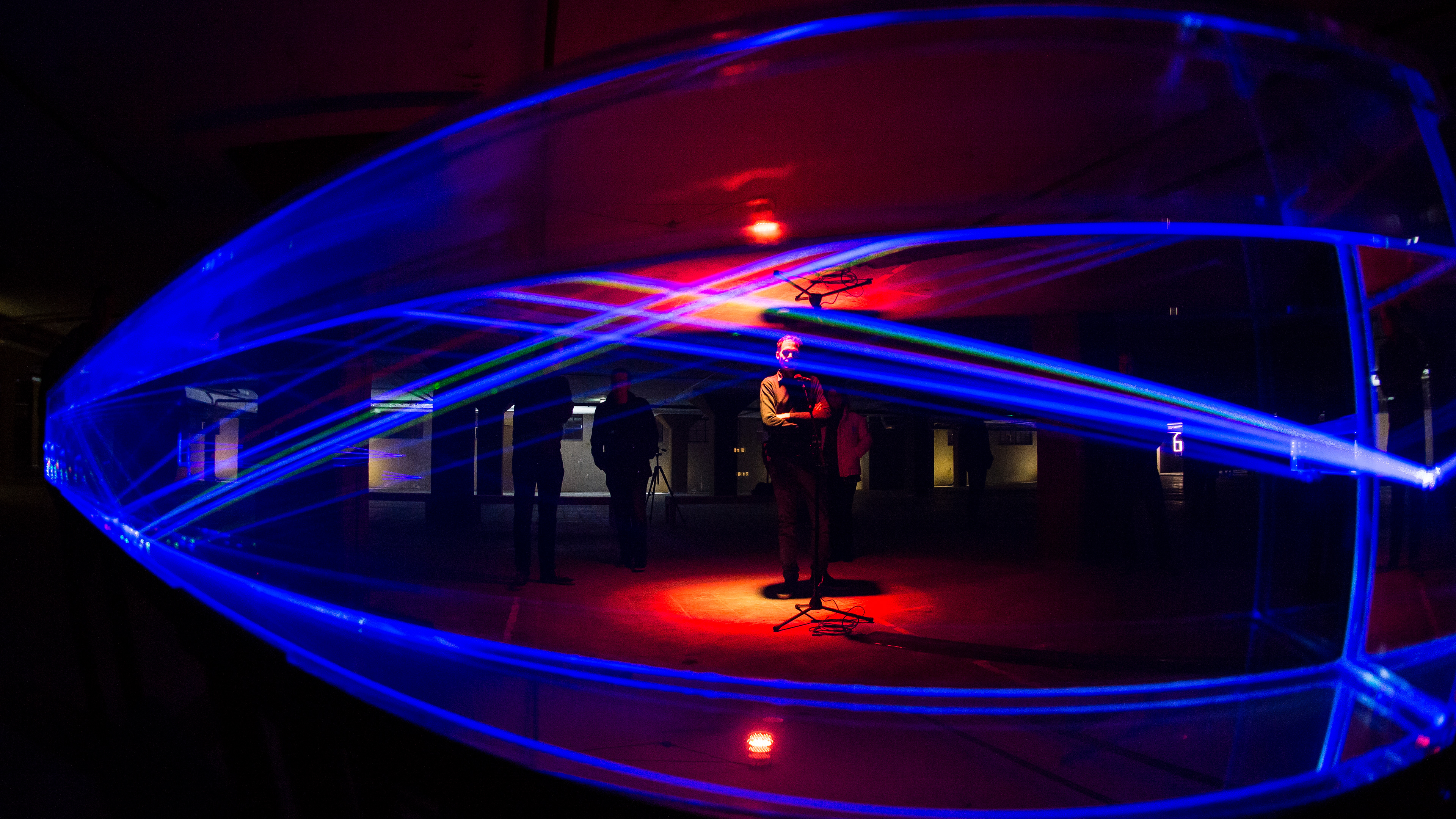 The light of Lightlab Quartet was inspired by the phenomena of internal reflection in the fiber-optic cables that connect the world’s communication systems. By conducting many experiments with projectors and lasers, creators Paul Thursfield and Simon Rycroft succeeded in using internal reflection in water to express the rhythm and dynamic of sound through strings of light.